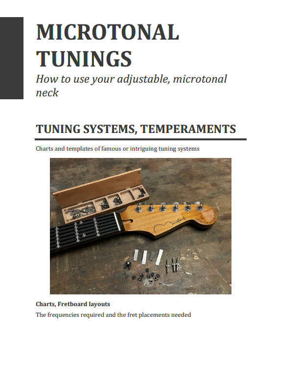 Adjustable microtonal electric guitar neck with grooves securing fretlets. Includes fretless frets and all tools for installing/removing them. Fretboard made of acoustically tested material (6mm thick, 650 Scala gridlines, 72 TET system). Stainless steel frets (1.1mm height, 2mm wide), colour-coded fretless fretlets. Accessories include four extra frets sizes, long frets for bending, a fret tuner for fine-tuning, a plier for fret installation/removal, scriber fret for measuring/marking fret positions, accessory pouch, and a hard case for transportation.